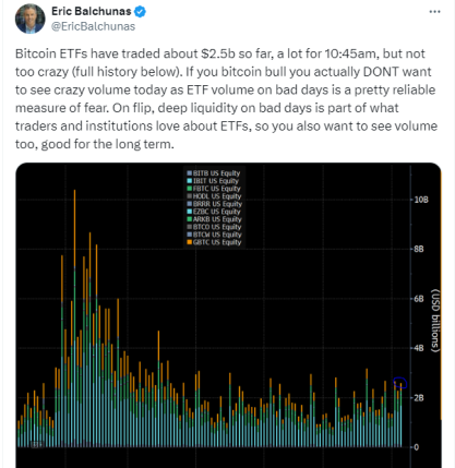 در یک پست X در اوایل روز معاملاتیاریک بالچوناس، تحلیلگر ETF بلومبرگ، هشدار داد که «حجم دیوانهوار» در طول شکست بازار عموماً یک «معیار کاملاً قابل اعتماد برای ترس» است.