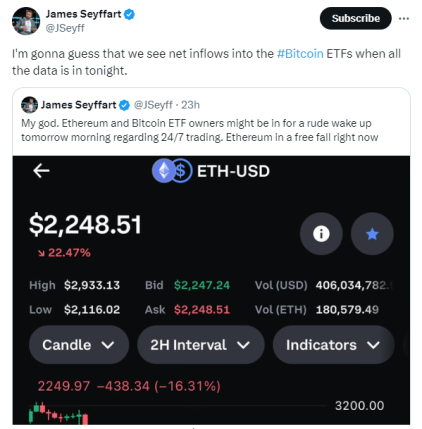 با این حال، جیمز سیفارت، تحلیلگر ETF بلومبرگ، در پستی در تاریخ 5 اوت در X، پیشبینی میکند که پس از انتشار همه دادهها، ETFهای بیتکوین به جریان خالص وارد میشوند.