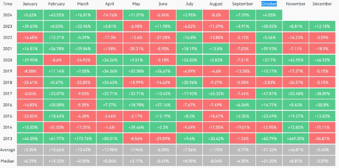دادههای کوین گلس نشان میدهد که “Uptober” – اصطلاحی صعودی برای اکتبر که شاهد افزایش قیمت بیتکوین در 9 مورد از 11 اکتبر گذشته بوده است – اغلب فصلهای چهارم قوی را برای بیتکوین آغاز میکند .