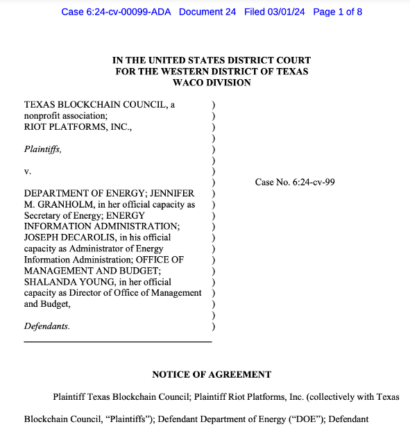 بر اساس یک پرونده در 2 مارس، وزارت انرژی ایالات متحده، اداره اطلاعات انرژی (EIA) و دفتر مدیریت و بودجه (OMB) با TBC و Riot توافق کرده اند تا جمع آوری اطلاعات از ماینرهای رمزنگاری را برای سه مورد پیشنهادی خود متوقف کنند. بررسی اضطراری سال تحت «درخواست جمعآوری اضطراری EIA-862» ثبت شده است.