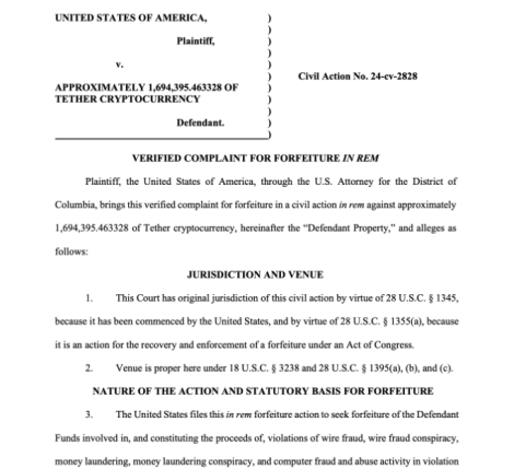 با توجه به پرونده های قانونی، دولت ایالات متحده به دنبال بازیابی حدود 1.7 میلیون دلار از Tether است که توسط این سازمان در هک Deribit در سال 2022 به سرقت رفته بود، که باعث شد مبادله گزینه ها 28 میلیون دلار خالی شود.