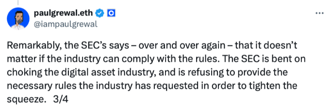 به گفته صرافی کوین بیس، کمیسیون بورس و اوراق بهادار ایالات متحده (SEC) تا زمانی که بتواند به هدف خود برای «خفه کردن» این صنعت را برآورده، رویکرد مقررات به اجرا را در صنعت ارزهای دیجیتال ادامه خواهد داد.