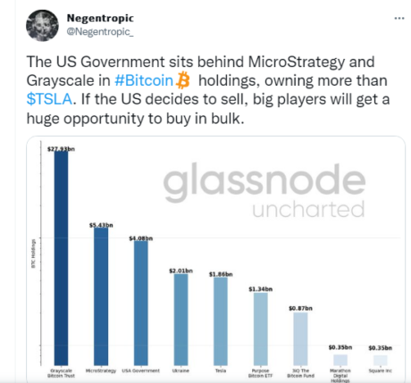 بر اساس دادههای Glassnode ، دولت ایالات متحده تقریباً ۴ میلیارد دلار بیتکوین توقیف شده را در اختیار دارد که آن را به یکی از دارندگان بزرگ بزرگترین ارز دیجیتال در کنار مایکرواستراتژی و مدیر دارایی Grayscale تبدیل میکند.