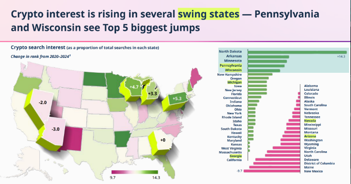 در 16 اکتبر، گزارش «وضعیت رمزنگاری 2024» شرکت سرمایه گذاری خطرپذیر آندرسن هوروویتز نشان داد که ایالت هایی مانند پنسیلوانیا و میشیگان شاهد افزایش علاقه به ارزهای دیجیتال بودند. در این گزارش همچنین اشاره شد که اکنون 40 میلیون آمریکایی دارای رمزنگاری هستند.