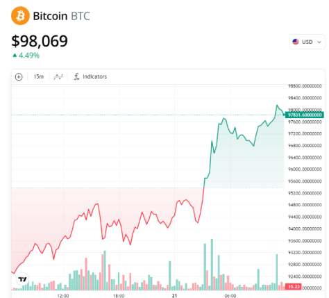 داده ها نشان می دهد که قیمت بیت کوین در حال حاضر با علامت 100,000 دلار در حال معاشقه است و تنها 2 درصد زیر بالاترین نقطه عطف معامله می شود و از ساعت 12:31 بعد از ظهر در UTC، قیمت بیت کوین به بالای 98,000 دلار تغییر می کند.