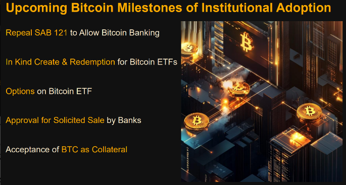 سایلور همچنین نقاط عطف سازمانی مهم دیگری را برای بیت کوین پیش بینی می کند، مانند ایجاد گزینه هایی در ETF بیت کوین، تایید فروش درخواستی توسط بانک های سنتی و پذیرش بیت کوین به عنوان یک دارایی وثیقه.