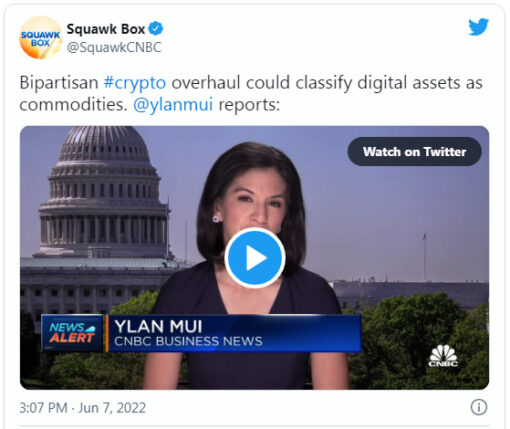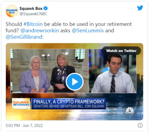 در طی یک مصاحبه آنلاین با اندرو راس سورکین، مجری CNBC، دو سناتور آمریکایی که لایحه جدیدی برای مقررات ارزهای دیجیتال ارائه کردند، اظهار داشتند که بیت کوین یک ذخیره عالی ارزش است و باید برای تنوع بخشیدن به دارایی ها در برنامه های بازنشستگی ایالات متحده استفاده شود.