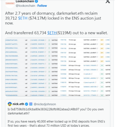 پس از سالها قفل شدن ۳۹۷۱۲ اتر در حراج سرویس نام اتریوم (ENS)، نهنگی با استفاده از دامنه «darkmarket.eth» داراییهای دیجیتال را پس گرفته و بیش از ۱۱۹ میلیون دلار ETH را به یک کیف پول جدید انتقال داده است.