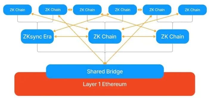 تصویر بالا تعامل بین زنجیره های مختلف در اکوسیستم ZKsync را به تصویر می کشد. خطوط خاکستری نشان دهنده اثبات هستند، در حالی که خطوط نارنجی نشان دهنده هایپرپل هستند.