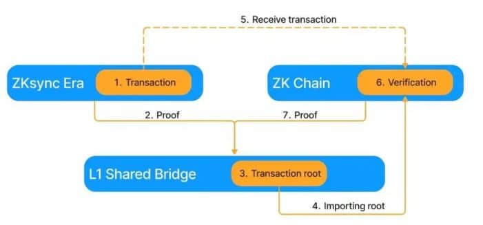 - شروع: یک تراکنش در یک ZKchain که برای زنجیره دیگری در نظر گرفته شده است آغاز می شود.