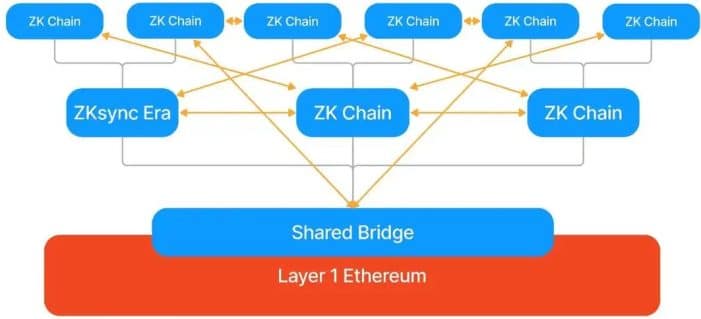 یکی از ویژگیهای برجسته ZK Stack، توانایی ایجاد زنجیرههای ZK است – نمونههای مستقل و در عین حال متصل و موازی از مجموعههای zkEVM که به اجماع و نهایی شدن در اتریوم دست مییابند. این زنجیرهها از طریق Hyperbridges به هم متصل میشوند و امکان همکاری اتمی بین آنها را فراهم میکنند. این بدان معناست که تراکنشهای زنجیرههای مبتنی بر ZK میتوانند فوراً بدون تکیه بر پلهای سنتی که خطرات امنیتی را ایجاد میکنند، تسویه شود.