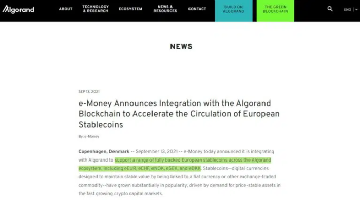 در سال 2021، این پروژه مشارکت قابل توجهی را با e-Money تضمین کرد و آنها را قادر ساخت تا ارزهای اروپایی و استیبل کوینها را در الگوراند منتشر کنند که میتواند آغاز CBDCهای اروپایی باشد.