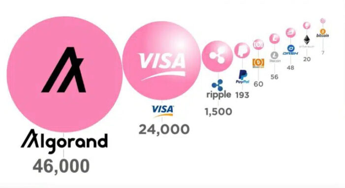 چهار هزار تراکنش از رقم 50000 TPS کم می شود زیرا حدود 1٪ از پیشنهادات نهایی نمی شوند. این امر باعث میشود که الگوراند از ریپل (XRP) و سالهای نوری جلوتر از بیتکوین و اتریوم جلوتر باشد.