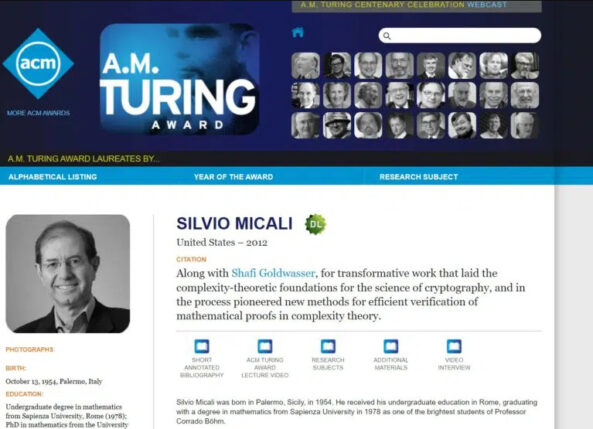 میکالی جایزه تورینگ را به خاطر مشارکت های اساسی خود در تئوری و عمل محاسبات دو طرفه ایمن، پول نقد الکترونیکی، ارزهای دیجیتال و پروتکل های بلاک چین دریافت کرد. اگر کسی واجد شرایط ایجاد یک پروتکل بلاک چین باشد که بتواند از آینده امور مالی پشتیبانی کند، سیلویو است.