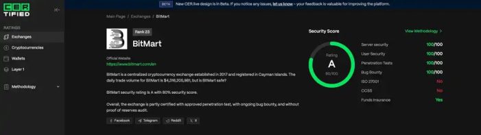 با این اوصاف، بیتمارت در ارائه اثبات شفاف ذخایر کوتاهی میکند و به کاربران اجازه میدهد تا داراییهای خود را تأیید کنند و به حسابرسیهای دقیق دسترسی داشته باشند، همانطور که توسط صرافیهایی مانند Bybit و OKX ارائه میشود. صرافی بیت مارت در عوض به اثبات ذخایر گزارش شده خود از طریق کوین مارکت کپ متکی است و برخی از آدرس های کیف پول داغ خود را افشا می کند. در حالی که اطمینان از نگهداری بیشتر دارایی ها در کیف پول سرد یک گام مثبت است، فقدان مدرک کاملاً قابل تأیید ذخایر زمینه ای برای بهبود است.