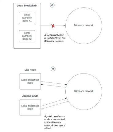 توجه به این نکته مهم است که اجرای یک گره زیرتنسور عمومی به صورت محلی با اجرای یک بلاک چین محلی برای اهداف توسعه و آزمایش یکسان نیست. یک بلاک چین محلی از شبکه بیتنسور جدا شده است و به طور خاص برای توسعه و آزمایش مکانیسم تشویقی زیرشبکه استفاده می شود.