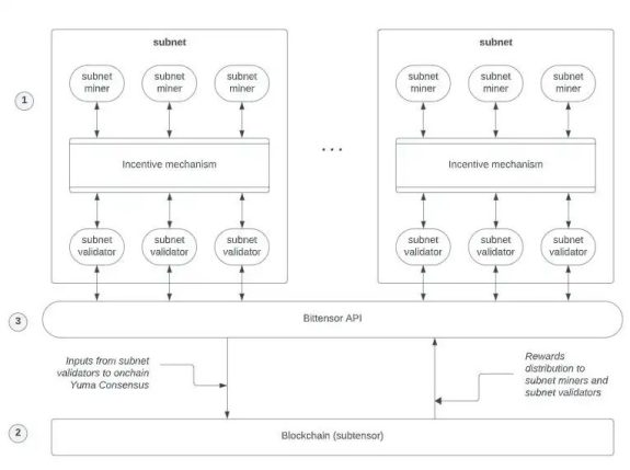 بلاک چین که ساب تانسور نامیده می شود، نقش مهمی در ثبت تمام فعالیت ها در هر زیرشبکه و تعیین پاداش برای استخراج کنندگان و اعتبارسنجی های زیرشبکه ایفا می کند. الگوریتمی به نام Yuma Consensus (YC) روی بلاکچین اجرا میشود و پاداشهای استخراجکنندگان و اعتبارسنجیها را بر اساس عملکرد هر ۱۲ ثانیه محاسبه میکند. سپس این جوایز در قالب توکن های TAO به کیف پول آنها واریز می شود.