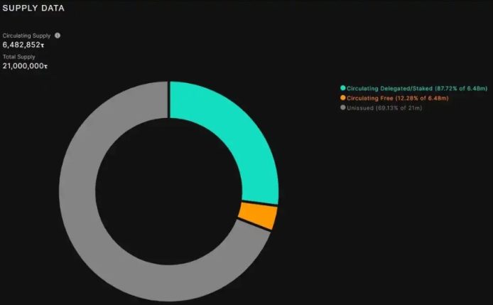 مجموع عرضه 21 میلیون توکن TAO در سیستم کدگذاری شده است. تقریباً هر 12 ثانیه یک بلاک جدید استخراج میشود و به ماینرها و اعتباردهندگان 1 TAO در هر بلوک پاداش میدهد. بر اساس برنامه تورم فعلی، این منجر به این می شود که 7200 TAO جدید در هر 24 ساعت توسط بیتنسور وارد گردش می شود که به طور مساوی بین استخراج کنندگان و اعتبار سنجی تقسیم می شود.