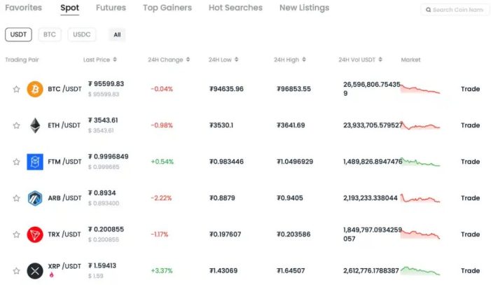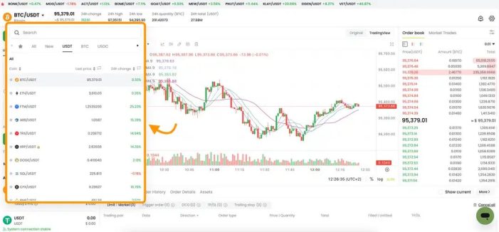 - فهرست جفتهای معاملاتی موجود را مرور کنید یا از تابع جستجو برای یافتن جفتی که میخواهید معامله کنید (به عنوان مثال، BTC/USDT) استفاده کنید.
