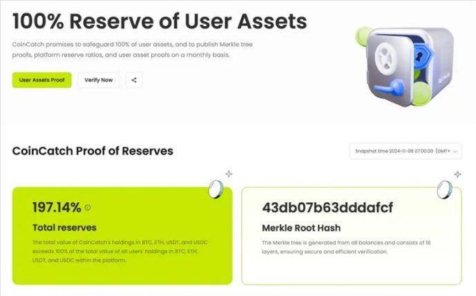 مطابق با استانداردهای صنعت، صرافی CoinCatch از اثبات ذخایر برای تأیید پشتیبانی دارایی کاربر استفاده می کند. همچنین اقدامات امنیتی قوی، از جمله احراز هویت دو مرحله ای (2FA)، کدهای ضد فیشینگ، و رمزهای عبور صندوق را اجرا می کند و از ایمنی حساب ها و وجوه کاربران اطمینان می دهد.