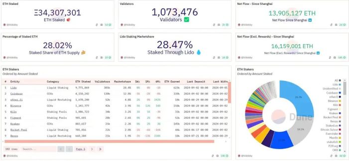 stETH و wstETH با هم زیربنای مدل سهامداری مایع Lido را تشکیل میدهند و گزینههایی را در اختیار کاربران قرار میدهند که استراتژیهای مختلف DeFi و ریسکپذیری را برآورده میکنند. طبق گزارش Dune Analytics، از سپتامبر 2024، لیدو فایننس جایگاه قابل توجهی در اکوسیستم سهامداری اتریوم دارد و 28.3٪ از کل اتریوم سهام را کنترل می کند و آن را به بزرگترین سهامدار در اتریوم تبدیل می کند. این موقعیت غالب، توانایی پروتکل لیدو فایننس را برای ارائه راهحلهای سهامداری مقیاسپذیر و انعطافپذیر که نیازهای متنوع جامعه اتریوم را برآورده میکند، برجسته میکند.