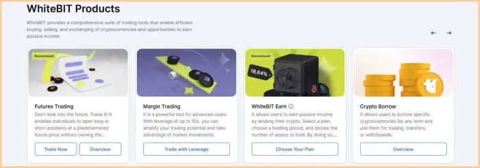 این پلتفرم از طیف متنوعی از محصولات و خدمات متناسب با معاملهگران مبتدی و حرفهای پشتیبانی میکند. کاربران به معاملات لحظهای، معاملات مارجین، معاملات آتی و استیکینگ دسترسی دارند. WhiteBIT همچنین یک توکن اختصاصی به نام WBT ارائه میدهد که مزایایی مانند کاهش کارمزد و دسترسی به ویژگیهای انحصاری را برای دارندگان فراهم میکند.