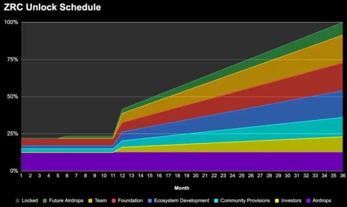 در مجموع 21.95 درصد از عرضه ZRC در رویداد تولید توکن (TGE) باز شد، از جمله: