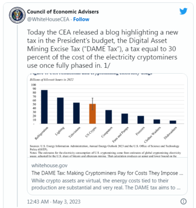 مالیات پیشنهادی برای استخراج رمزنگاری برای اولین بار در 9 مارس به عنوان بخشی از بودجه سال مالی 2024 رئیس جمهور جو بایدن اعلام شد و به دنبال اعمال مالیات غیر مستقیم 30 درصدی بر برق مصرفی توسط استخراج کنندگان رمزارز است.