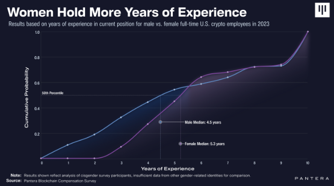 دستمزدهای بالاتر برای زنان ممکن است تا حدی به زنانی نسبت داده شود که تجربه بیشتری در شرکتهای رمزنگاری دارند در یک بازه زمانی متوسط 5.3 سال در مقایسه با 4.5 سال برای مردان.