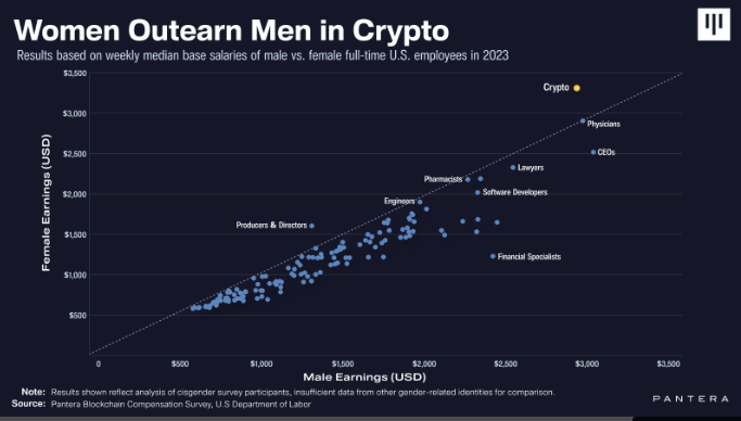 بر اساس نظرسنجی انجام شده توسط Pantera Research Lab، میانگین حقوق زنان شاغل تمام وقت مستقر در ایالات متحده در صنعت کریپتو 172000 دلار و مردان 150000 دلار بود.