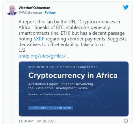 حساب کاربری تحت مدیریت جامعه از علاقه مندان به ریپل WKahneman@ نکات مهم آخرین گزارش در مورد چشم انداز ارزهای دیجیتال در آفریقا را که توسط تیم برنامه توسعه سازمان ملل متحد تهیه شده است، به اشتراک گذاشت.